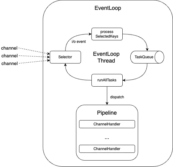 내부적으로 Selector를 이용해 특정 이벤트가 발생할 때까지 대기하다가 이벤트가 발생하면 적절한 핸들러로 이벤트를 전달(dispatch)해 처리하는 역할을 무한 루프로 실행해 반복하던 Reactor가 바로 이벤트 루프이다.