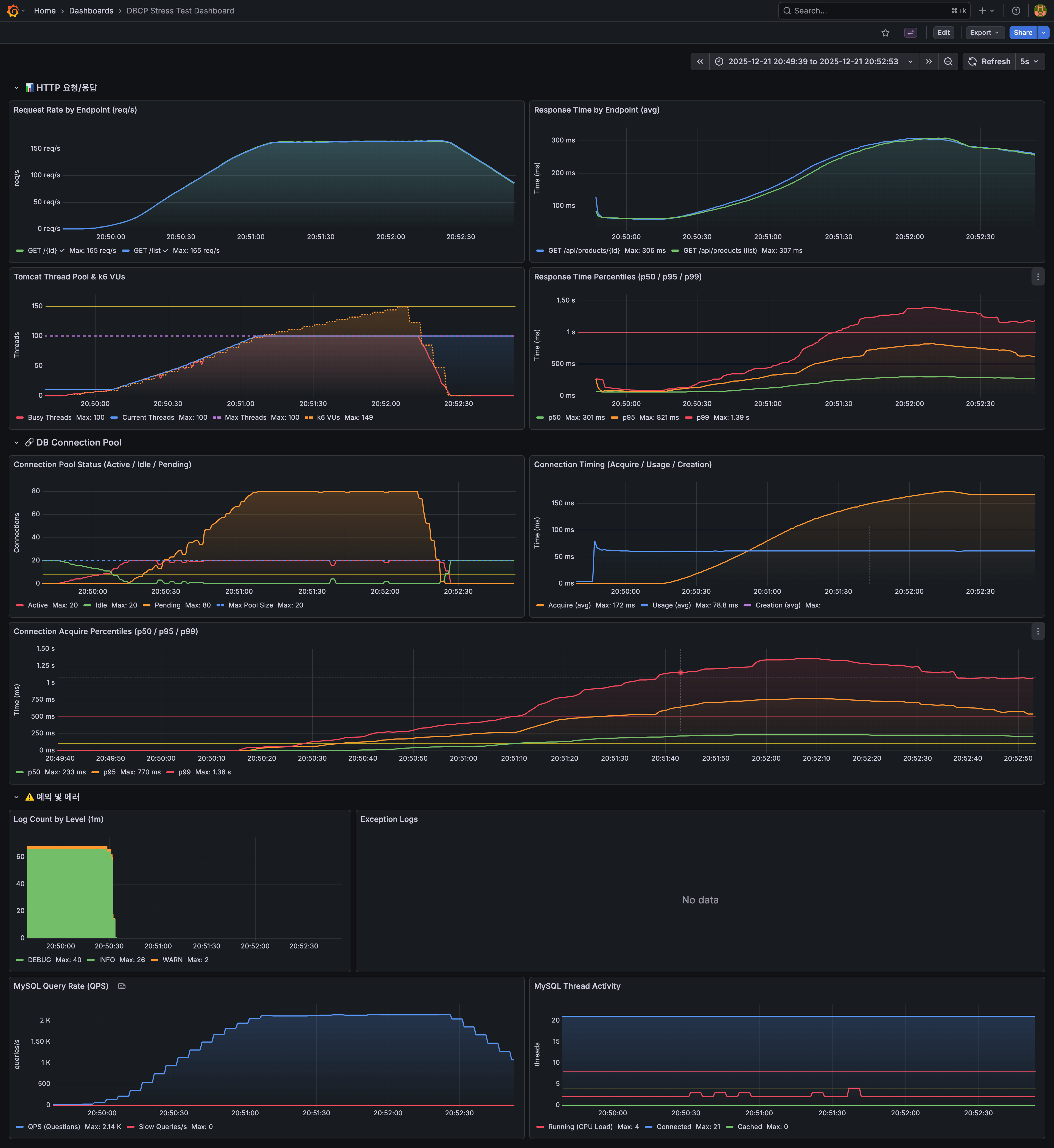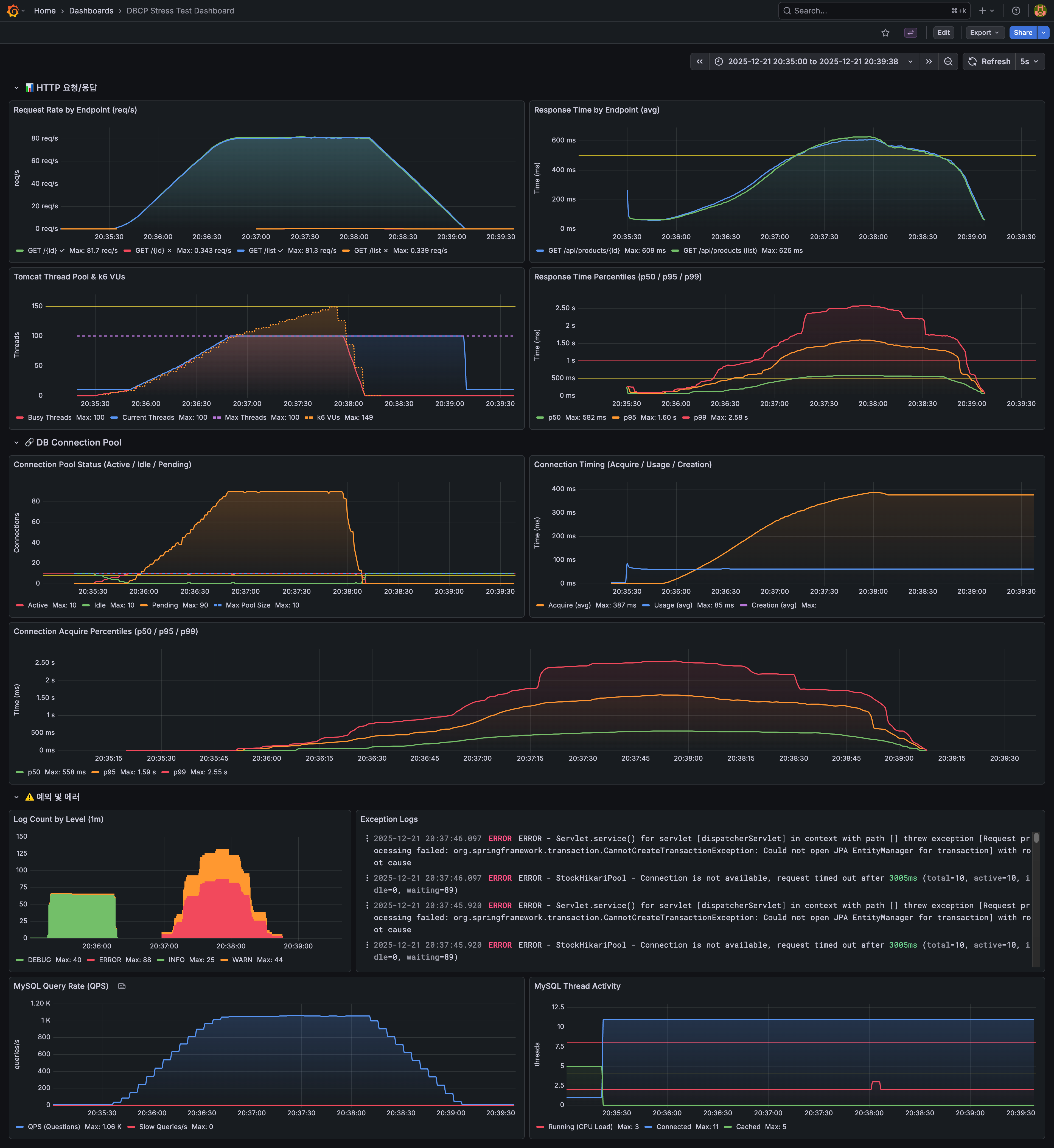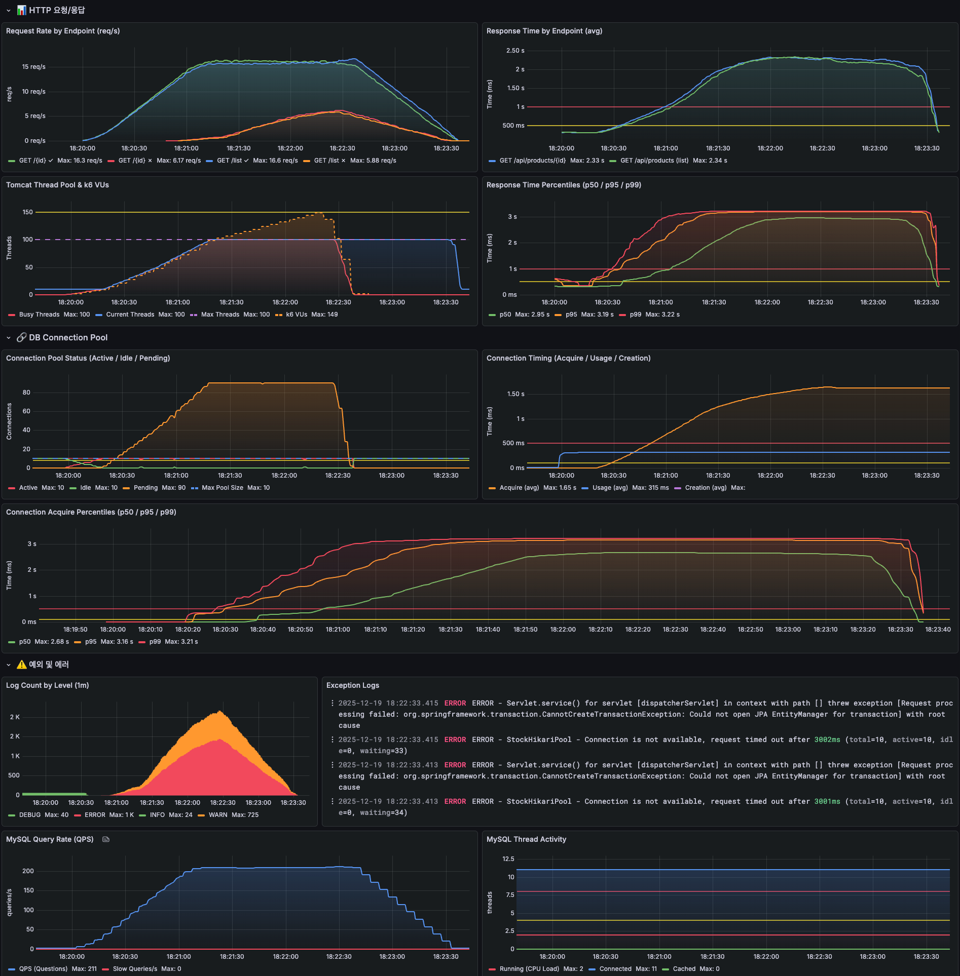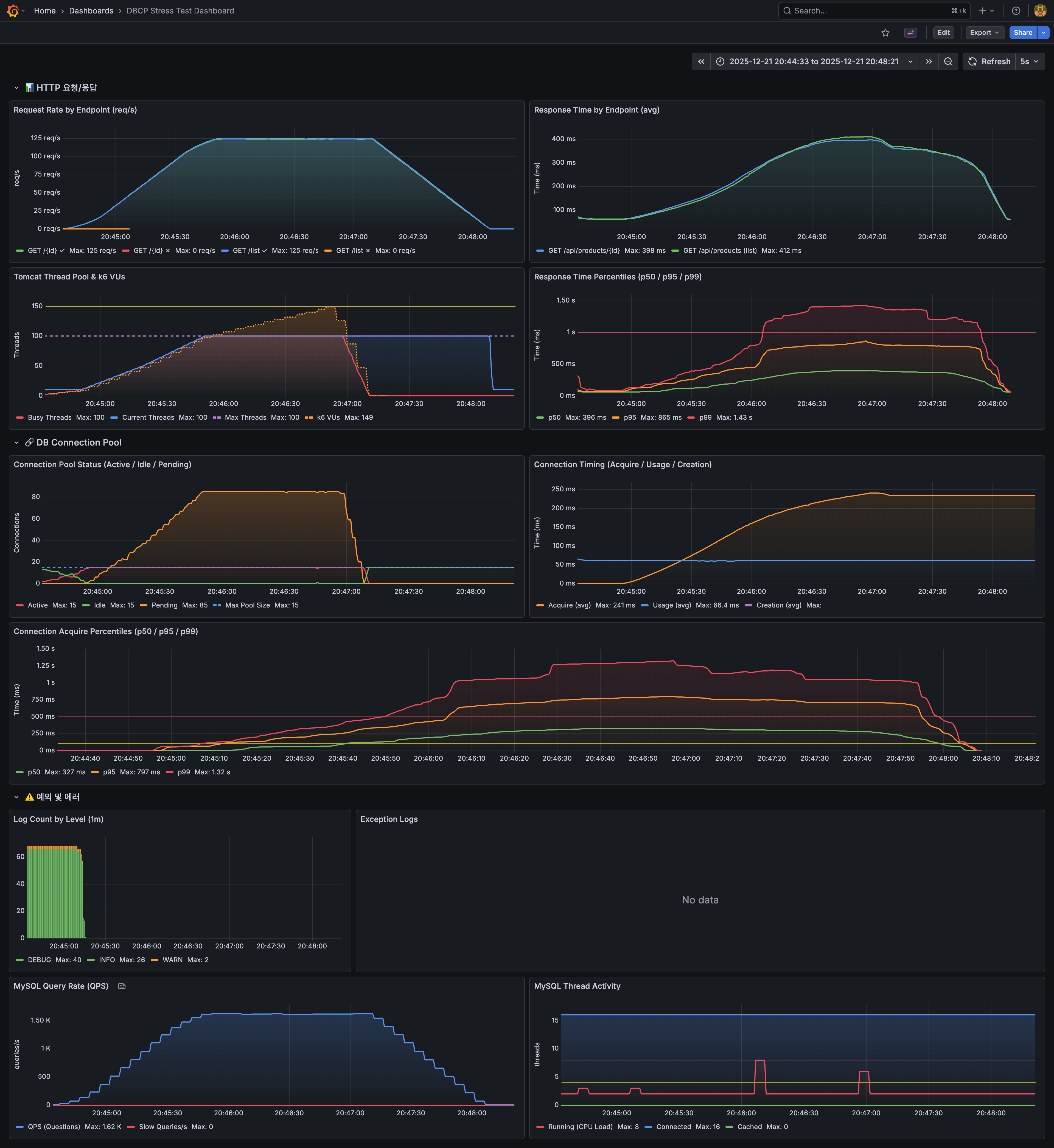 | Connection Acquire p99 | 3초에서 평탄화 (커넥션 획득 대기가 db connection-timeout에 의해 제한됨) |