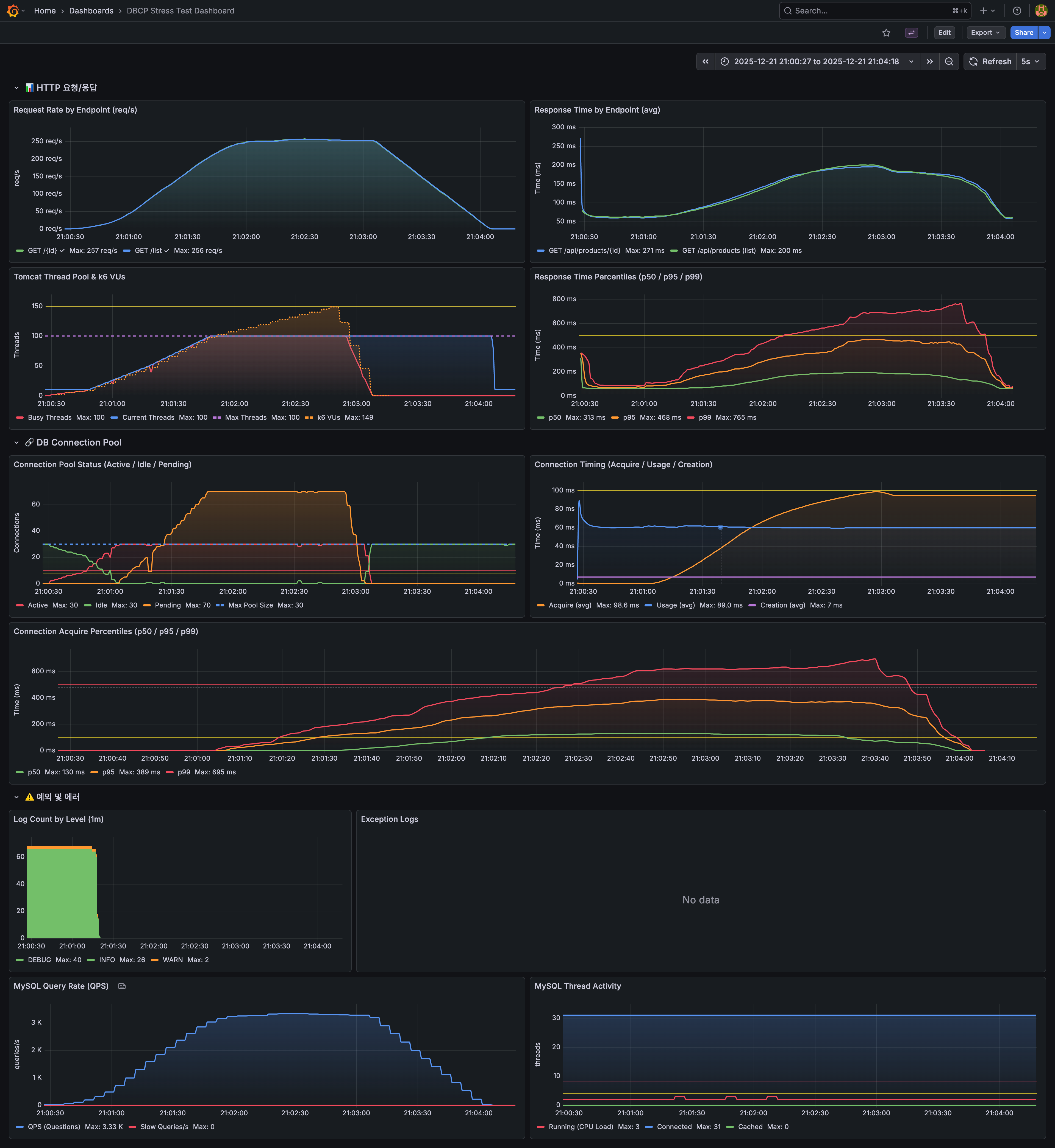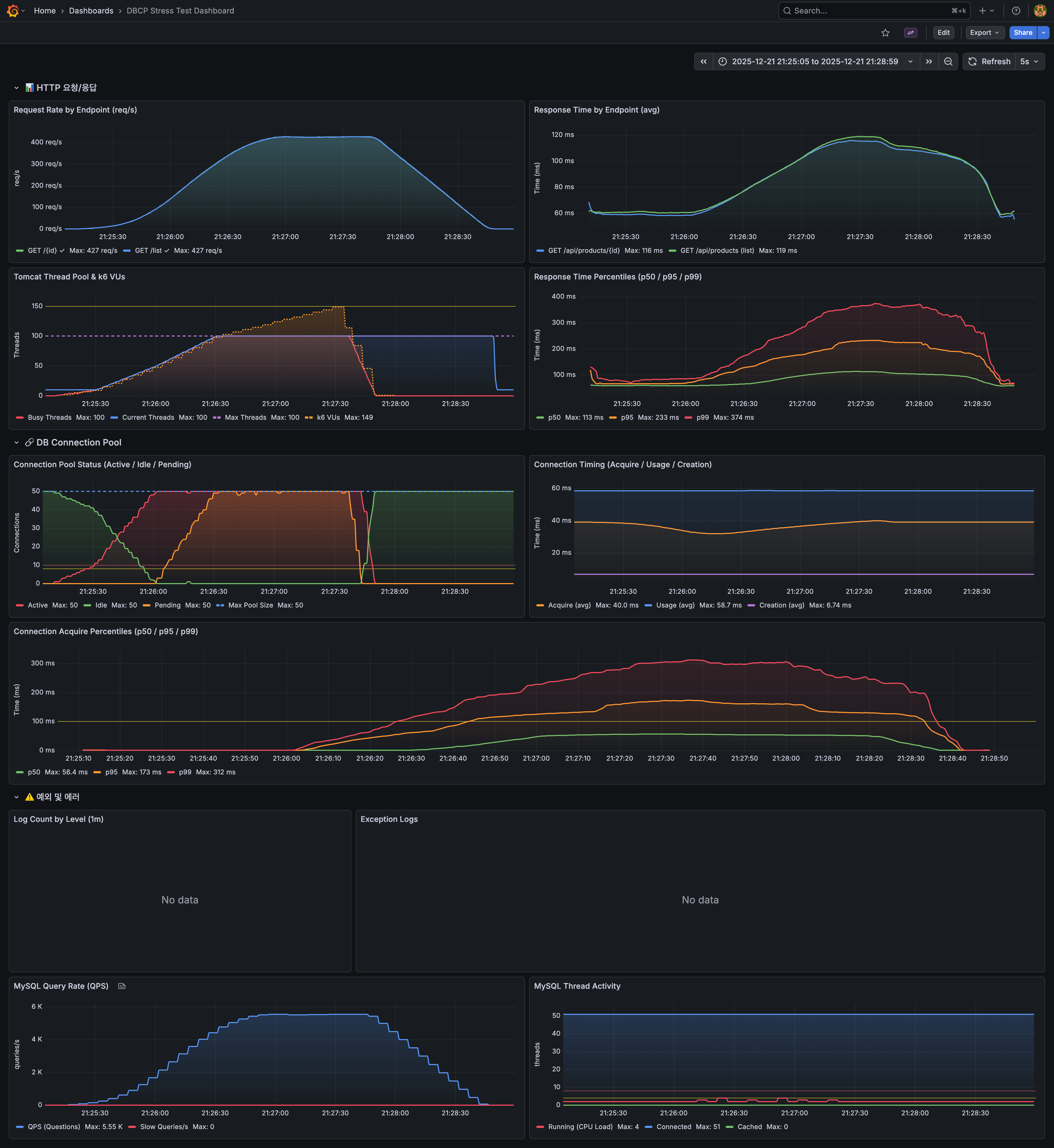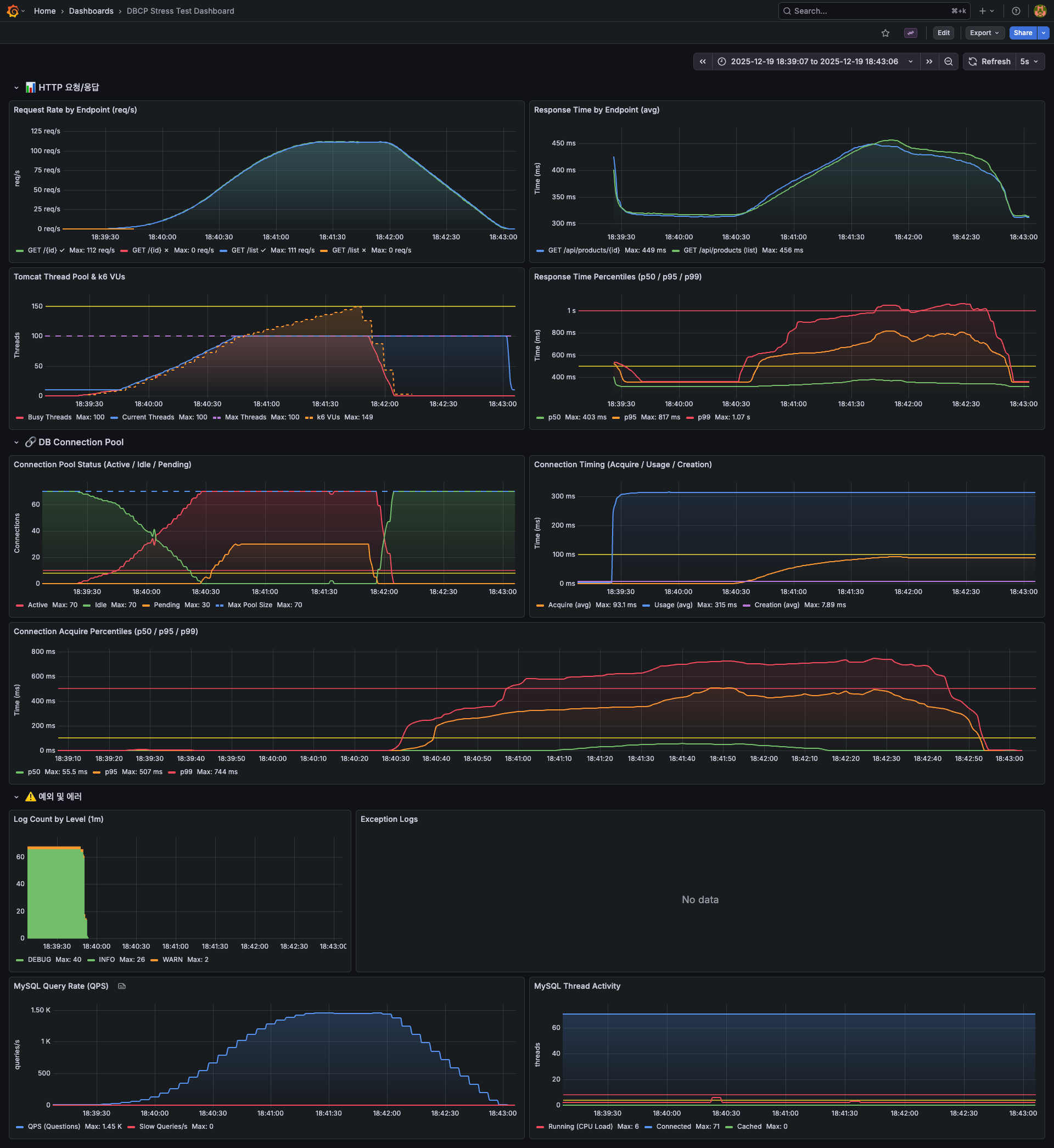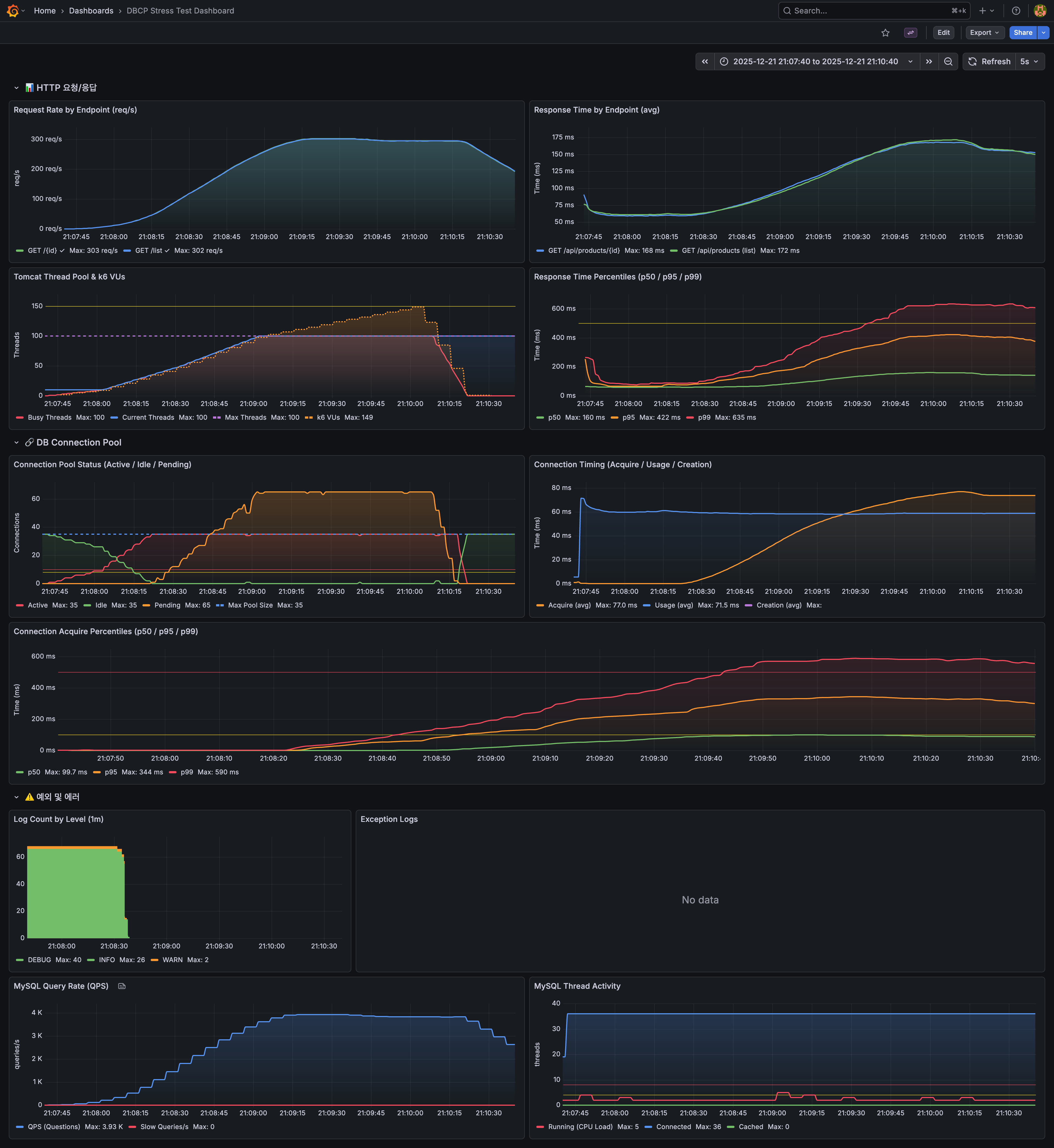 | Connection Acquire p99 | 3초에서 평탄화 (커넥션 획득 대기가 db connection-timeout에 의해 제한됨) |