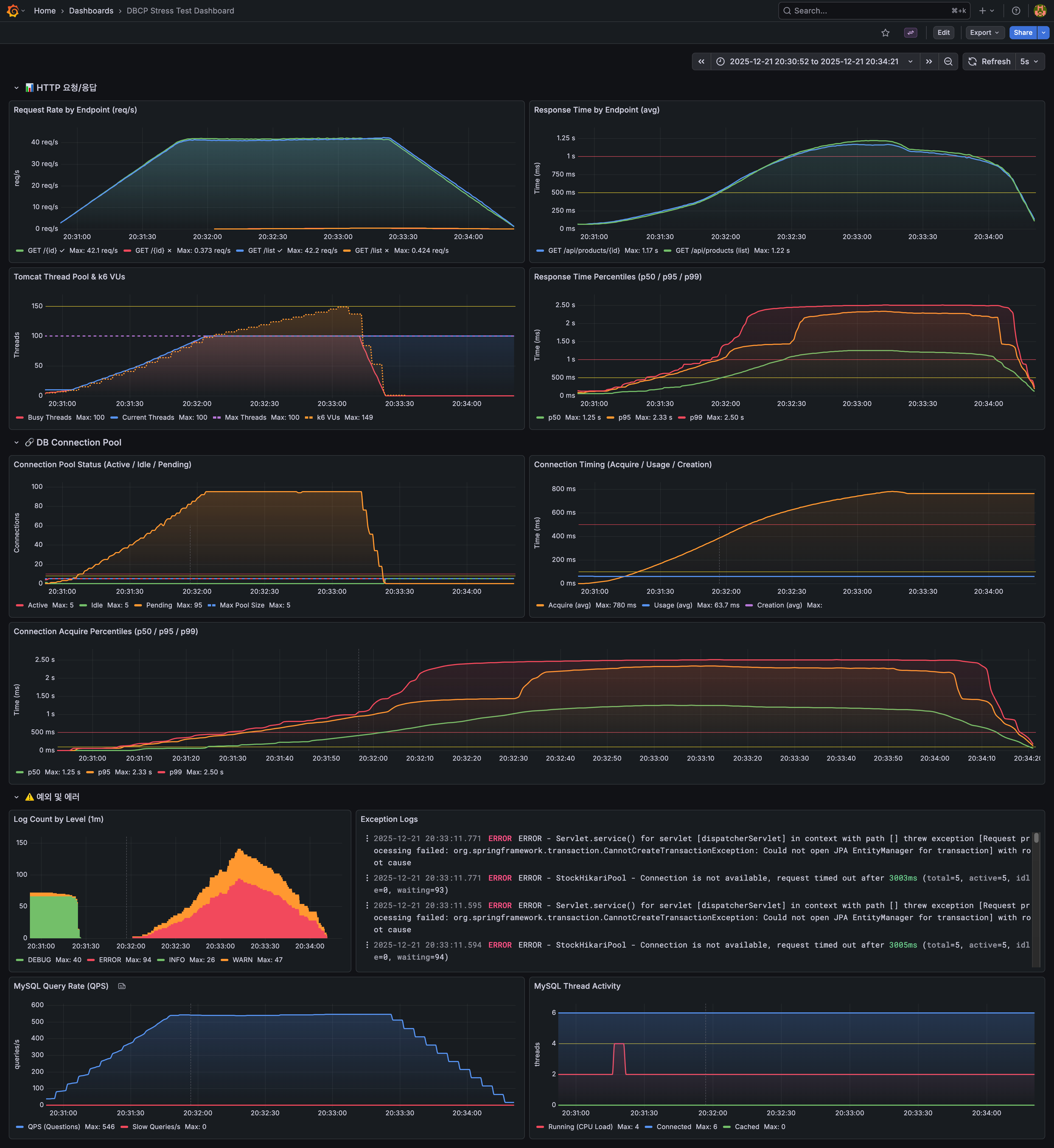 그래서 의도적으로 병목 상황을 만들고, k6 부하 테스트와 Grafana 모니터링을 통해 임계점을 직접 확인하면서 최적의 pool size를 찾아보려 한다.